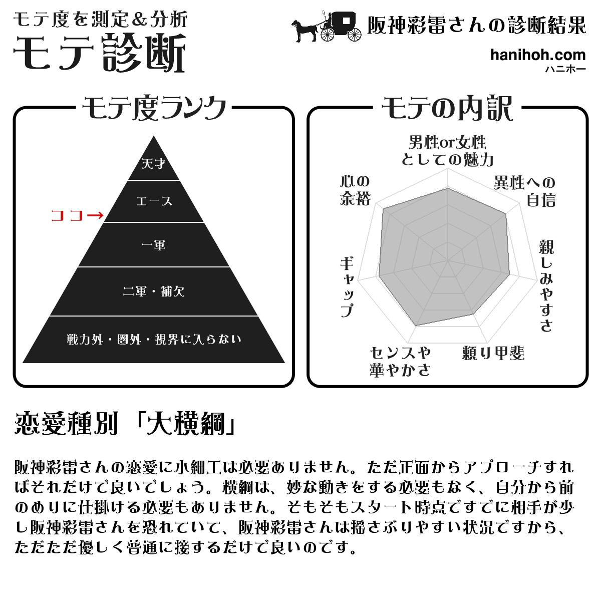パワフルで才能があり、精神も前向きで強靭、競争心も強くビジネス向きの性格です。かなりガツガツしているイメージで、失礼な表現ですが「成功するゴキブリ」という感じです。もう少し美しさやオシャレさがあれば、さらに化けるのですが。恋愛種別 「剣豪」